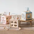 ビーズコースター、型はめ、歯車、迷路、回転パネルなど、ひとつのキューブで5種類以上の遊びが楽しめる木のおもちゃです。